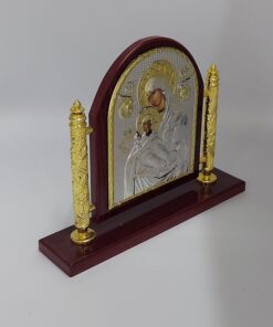 Μεταλλική εικόνα του Άγιου Γεωργίου με επάργυρο πουκάμισο, ασημένιες και χρυσές λεπτομέρειες και καφέ σκαλιστό ξύλινο πλαίσιο που απεικονίζει τον Άγιο Γεώργιο.