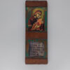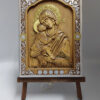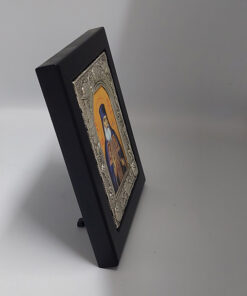 Εικόνα της Παναγίας Αμόλυντος σκαλισμένη σε φυσικό ξύλο λεύκας, με σκαλισμένα σχέδια περιμετρικά και με ασημένιες και χρυσές λεπτομέρειες, αναπαριστά την Παναγία Αμόλυντο να κρατά το Χριστό. Αντίγραφο βυζαντινής εικόνας.