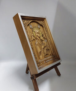 Μεταλλική εικόνα της Παναγίας Βοηθείας με επάργυρο σκαλιστό πουκάμισο ασημένιο και χρυσό, με καφέ σκαλιστό ξύλινο πλαίσιο που απεικονίζει τη Παναγία Βοήθεια.